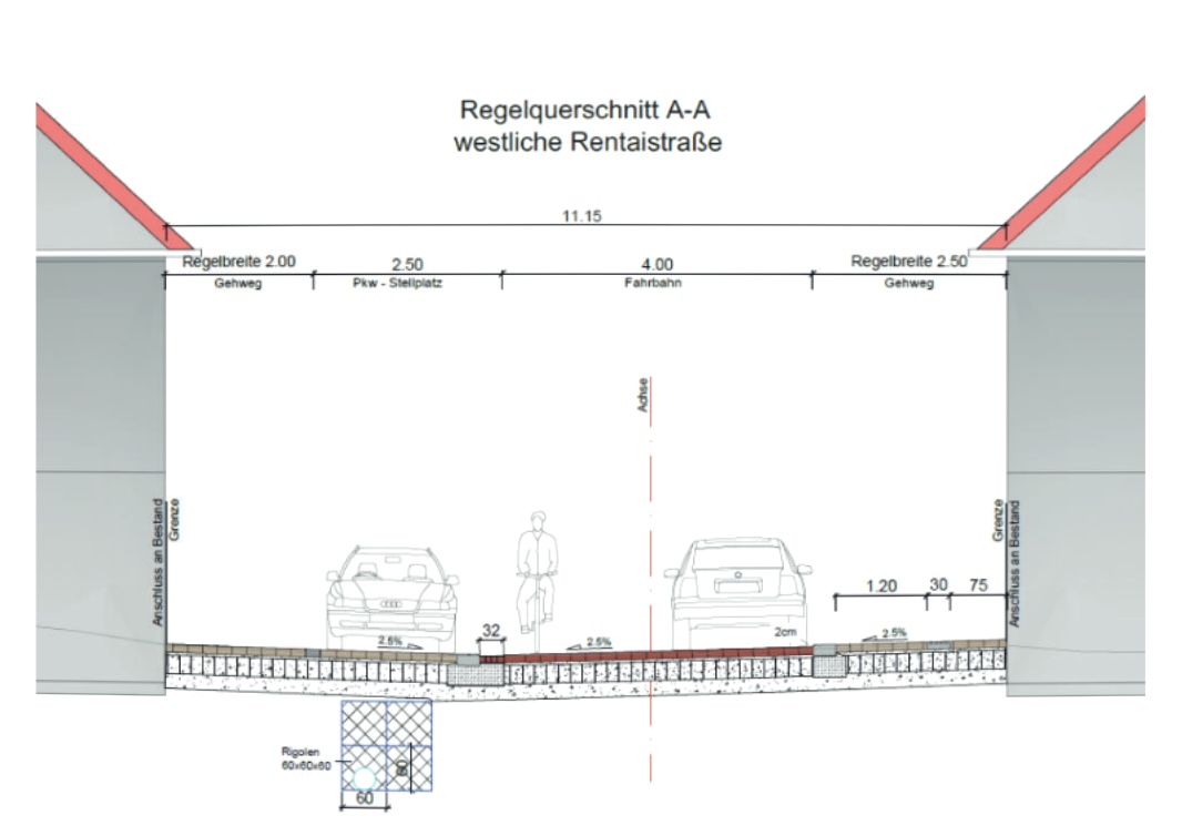 Die Renteistraße wird im ersten Bauabschnitt umgestaltet. Die Fahrbahn erhält eine Breite von vier Metern. Auf der Südseite wird ein 2,5 Meter breiter, barrierefreier Gehweg mit taktilem Leitsystem entstehen. Der Gehweg auf der Nordseite wird zwei Meter breit sein. In der mittleren Renteistraße sind auf der Nordseite abwechselnd Parkplätze und Baumstandorte vorgesehen. Die neuen Bäume werden in Pflanzbeeten gesetzt.