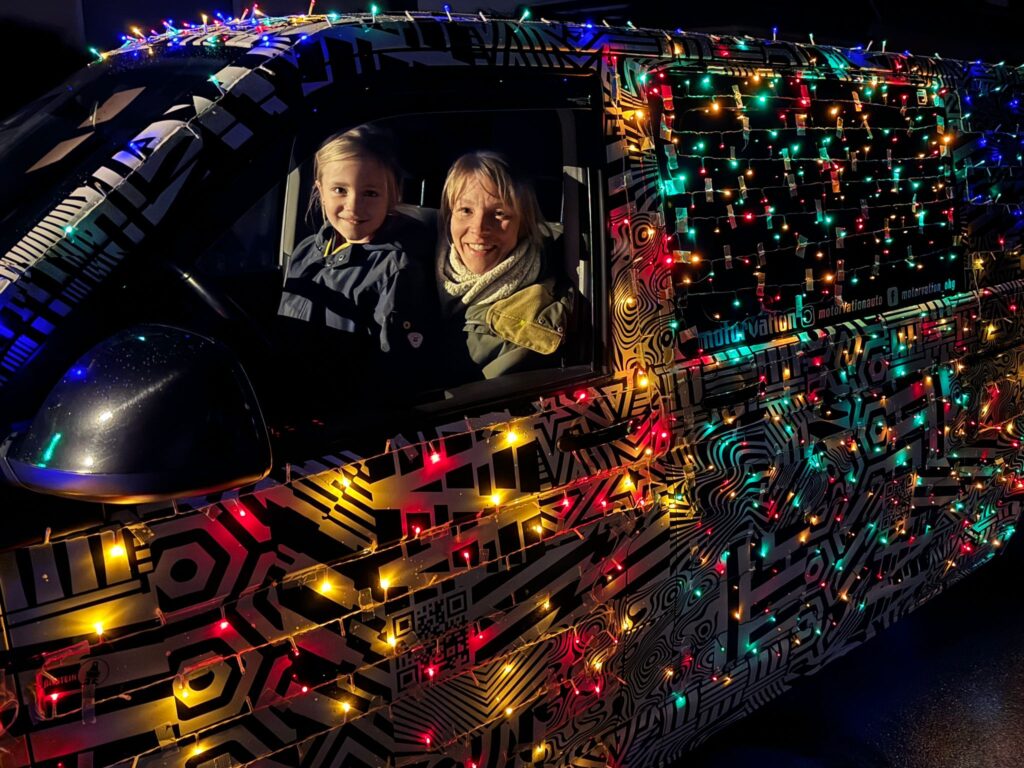 Inzwischen ist das Schmücken des Bullis jedes Jahr längst ein kleines Event. Das „Lichterkränzen“, wie die Familie es scherzhaft nennt, wird mit guten Freunden, Pizza und Getränken gefeiert. „Viele Hände, schnelles Ende – oder wir genießen einfach die gesellige Atmosphäre“, berichtet Kathrin lachend. Die 15 Ketten werden gemeinsam in mehreren Stunden mit Gaffa-Tape und Tesafilm an das Auto gebracht. Ganze 50 Meter Kleberolle brauchte es in diesem Jahr.