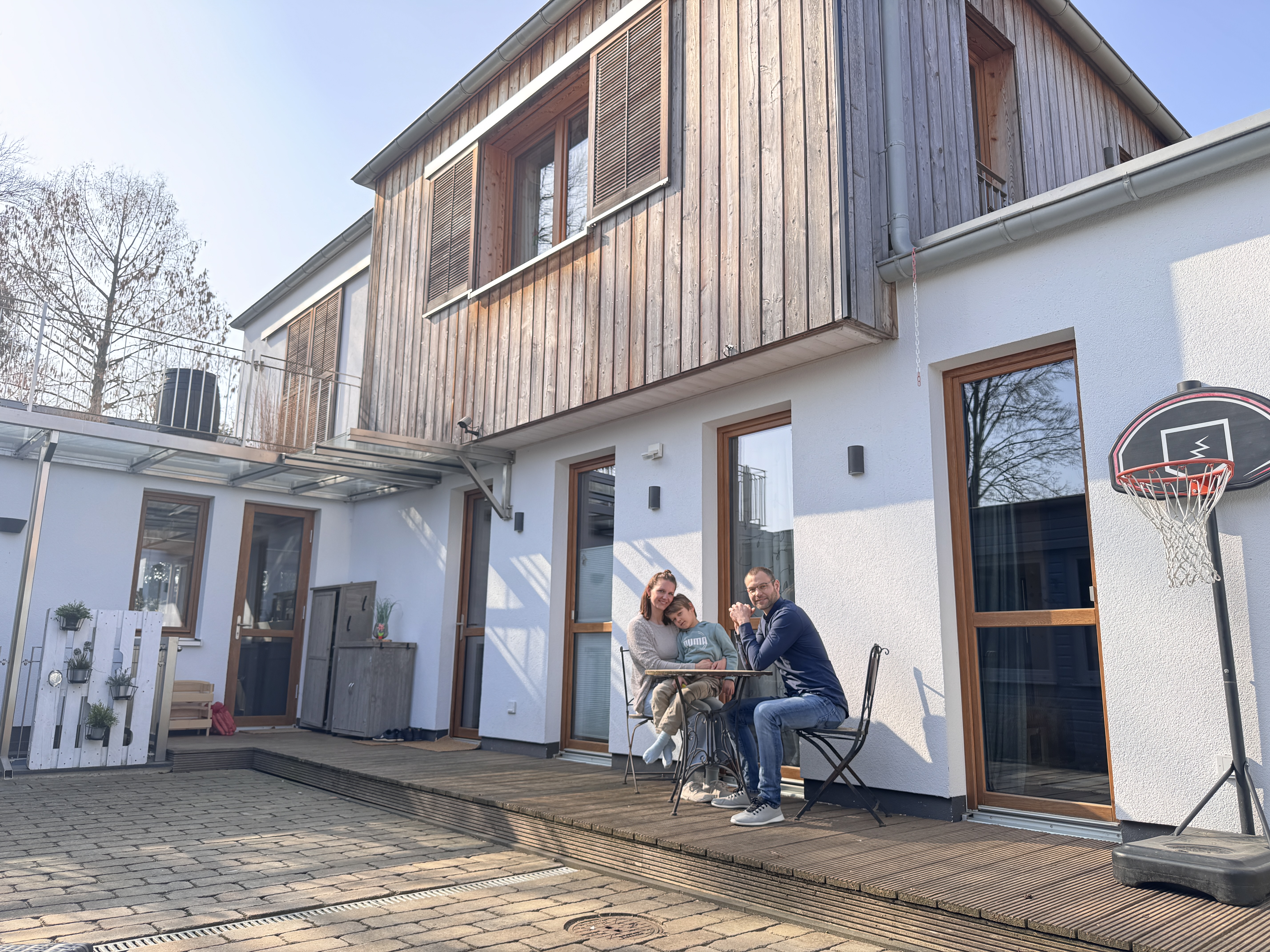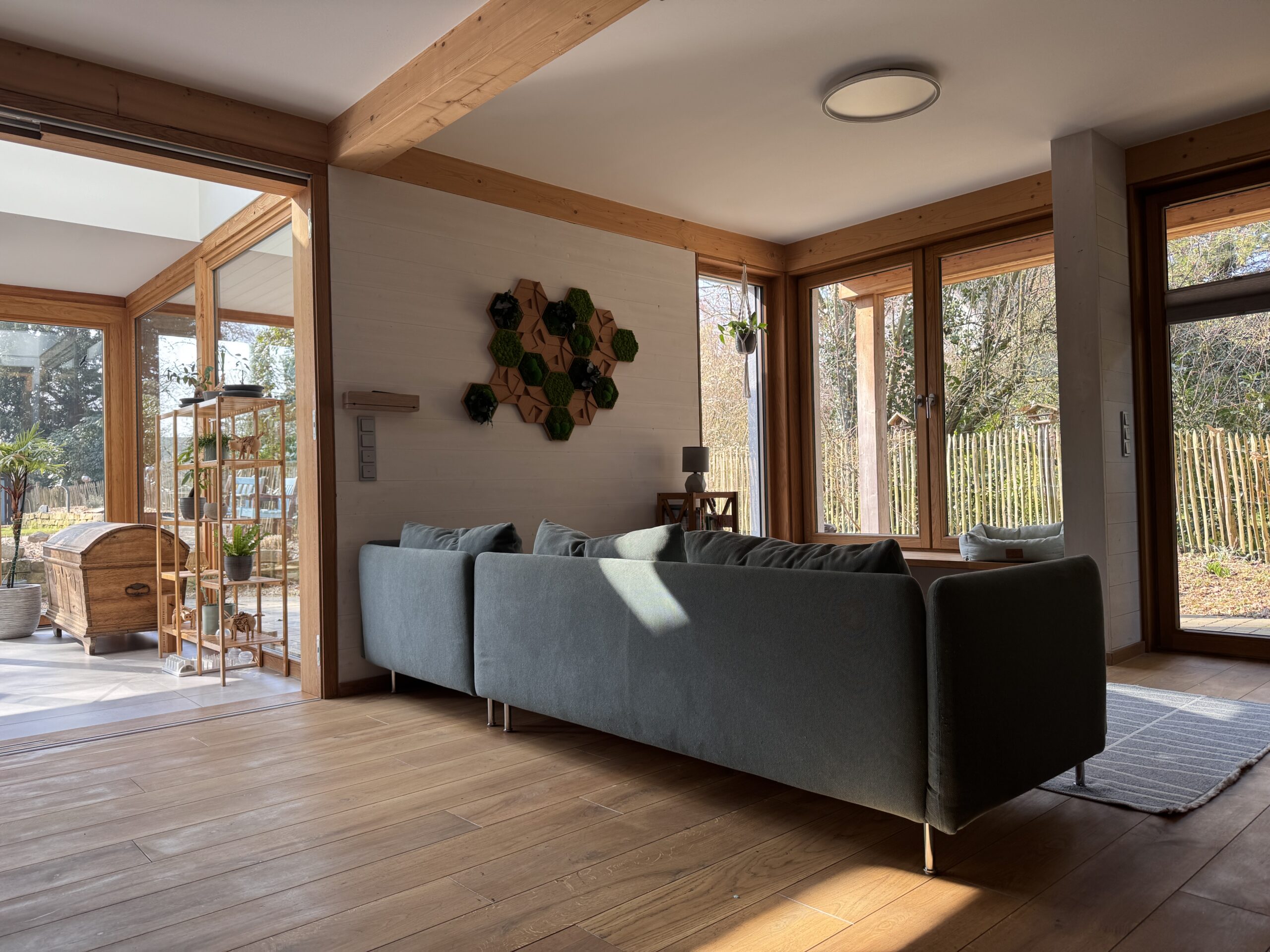 Das neue Haus wurde aus Vollholz gebaut, ökologisch, nachhaltig und warm. Mit Lehmputz, Holzdämmung, großen Fenstern und hellen Räumen. 220 Quadratmeter, 12 Zimmer, ein Wintergarten – Zaun an Zaun mit Mareikes Mutter Helga.
