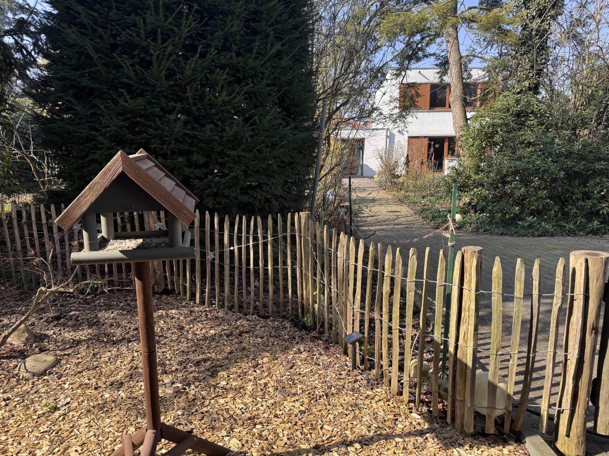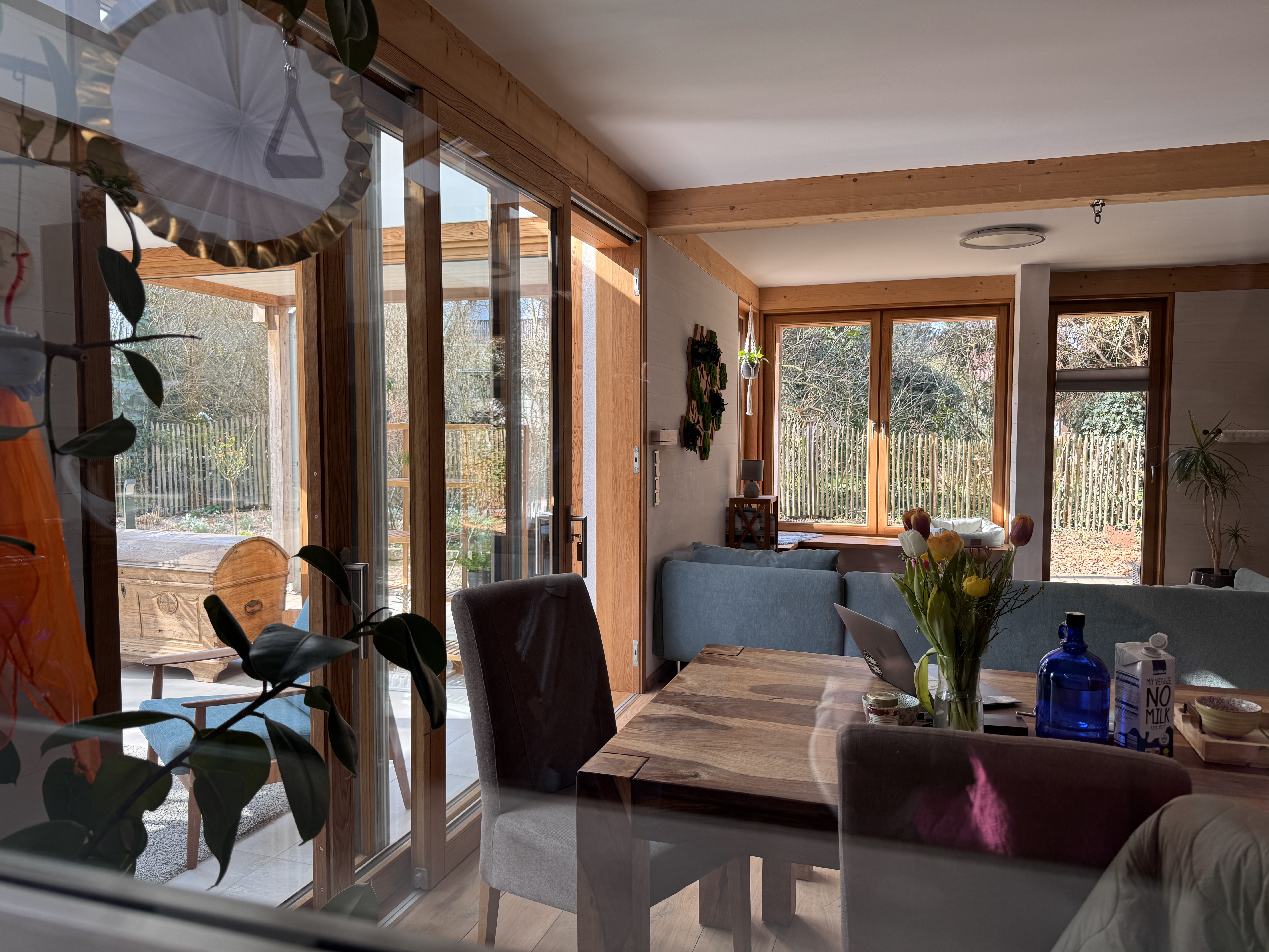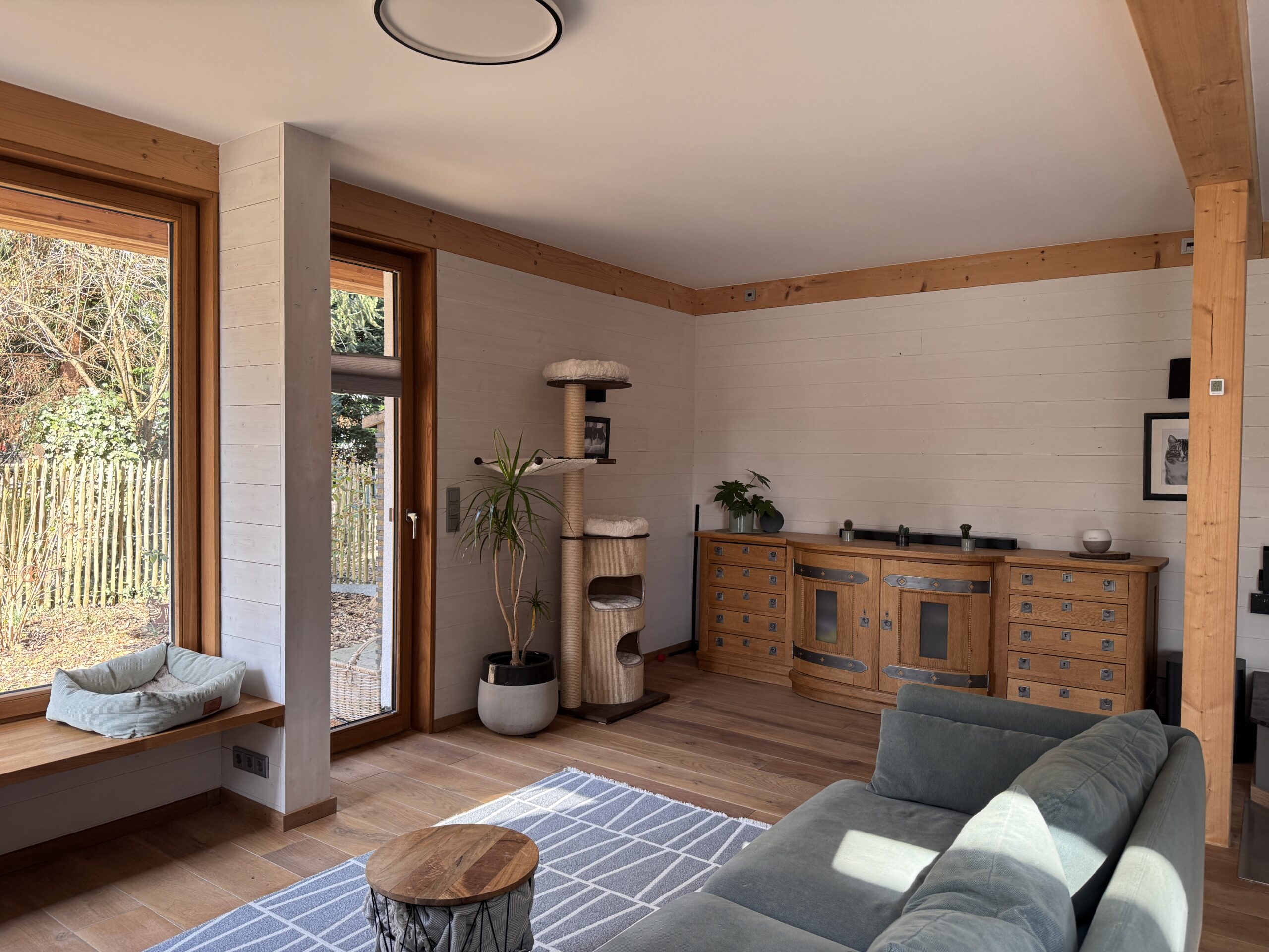 Wer durch das Eingangstor tritt, sieht erst einmal nichts von all dem. Von der Straße aus wirkt das Haus unscheinbar. Doch wer eintritt, spürt sofort, dass hier etwas Besonderes ist: Die Ruhe unter den alten Bäumen. Das Licht, das durch die großen Fenster fällt. Die Wärme des Holzes.