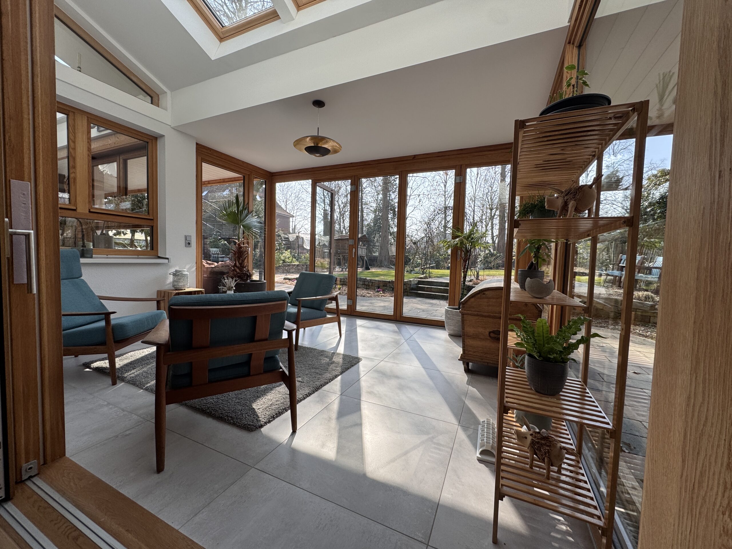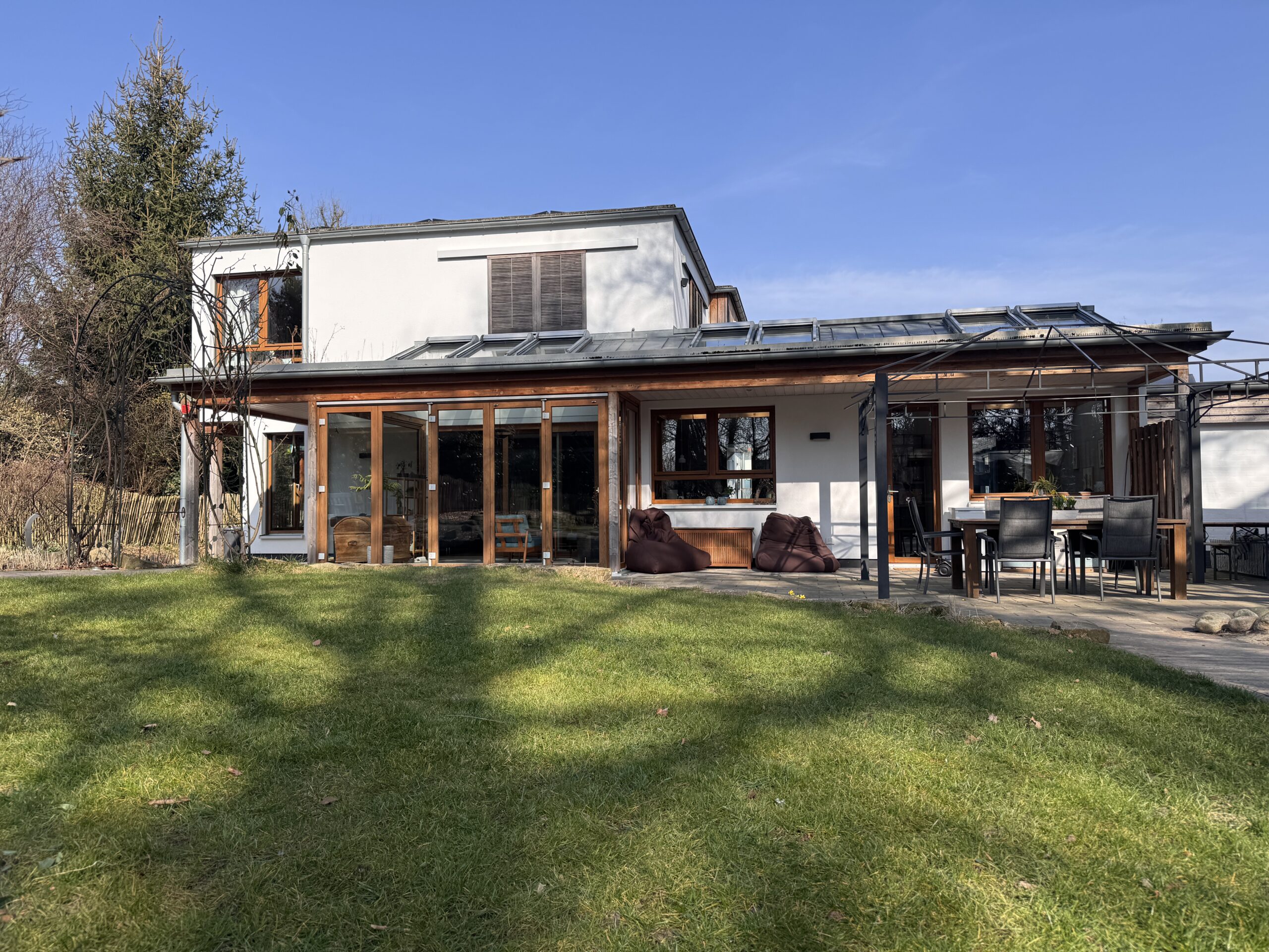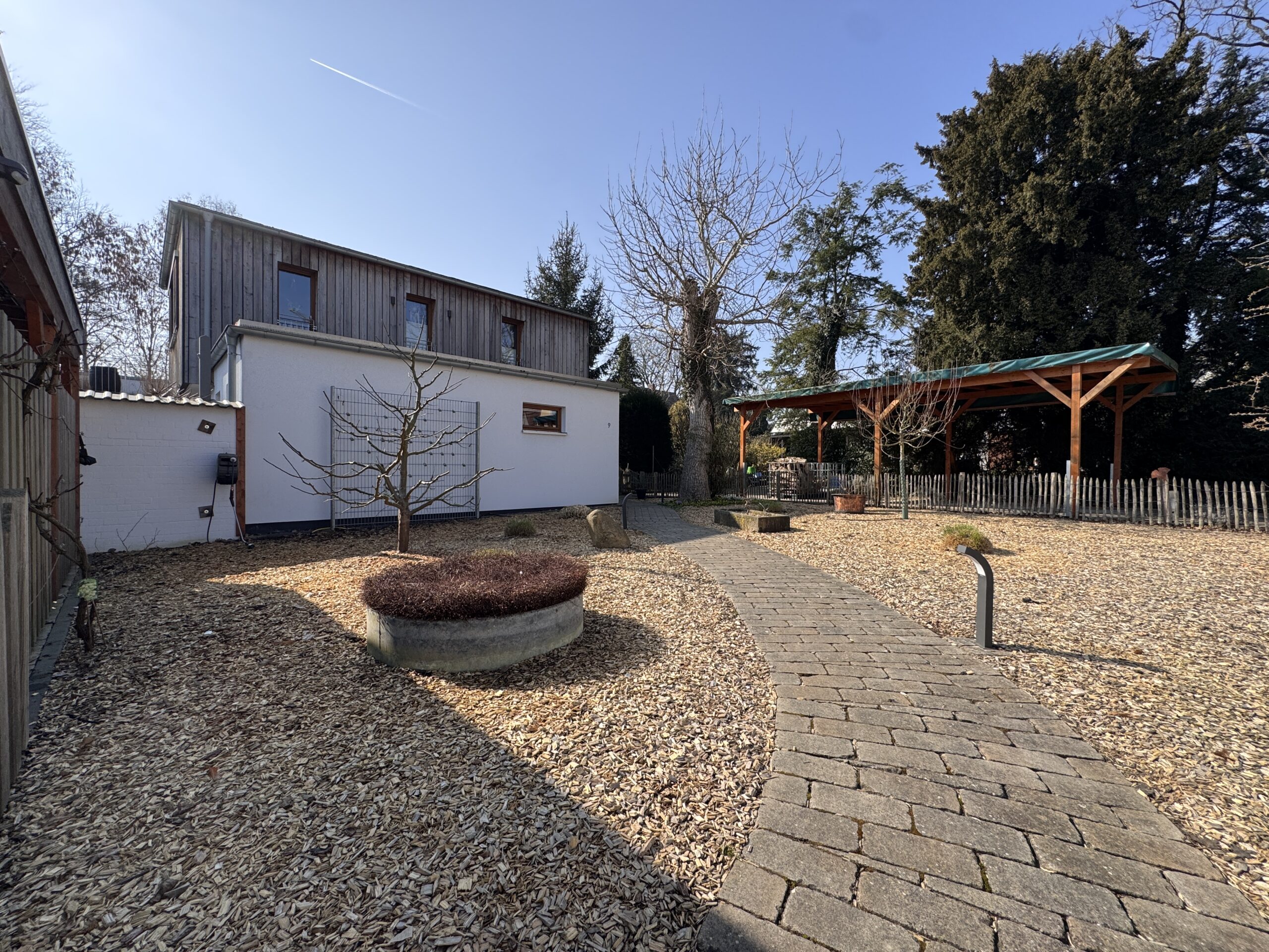Wer durch das Eingangstor tritt, sieht erst einmal nichts von all dem. Von der Straße aus wirkt das Haus unscheinbar. Doch wer eintritt, spürt sofort, dass hier etwas Besonderes ist: Die Ruhe unter den alten Bäumen. Das Licht, das durch die großen Fenster fällt. Die Wärme des Holzes.