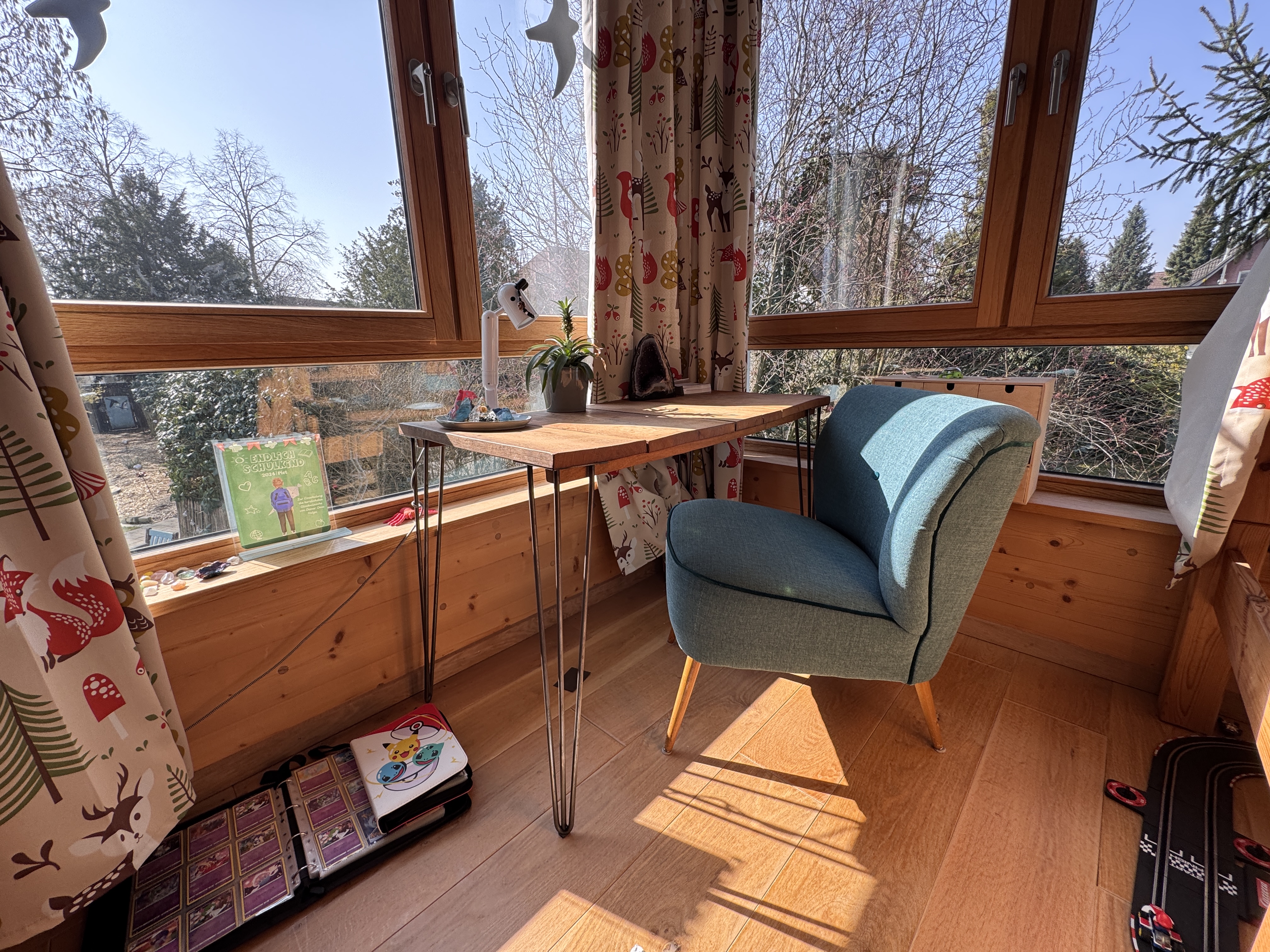 Auch Opa Ludwigs alte Möbel haben wieder einen Platz gefunden: Zwei seiner alte Kommoden stehen neu aufbereitet im Wohnzimmer und sein alter Sessel hat eine neue Aufgabe am Schreibtisch von Piet gefunden. Und dann gibt es da noch eine Besonderheit: Den alten Pool hat die Familie nicht entfernt, sondern umfunktioniert. Eine Holzplatte bedeckt ihn, darunter verbirgt sich nun eine Spielhöhle für die Kinder – beleuchtet mit den original Poollichtern. Opa Ludwigs großen Gemüsegarten bewirtschaften sie mit drei weiteren Familien.