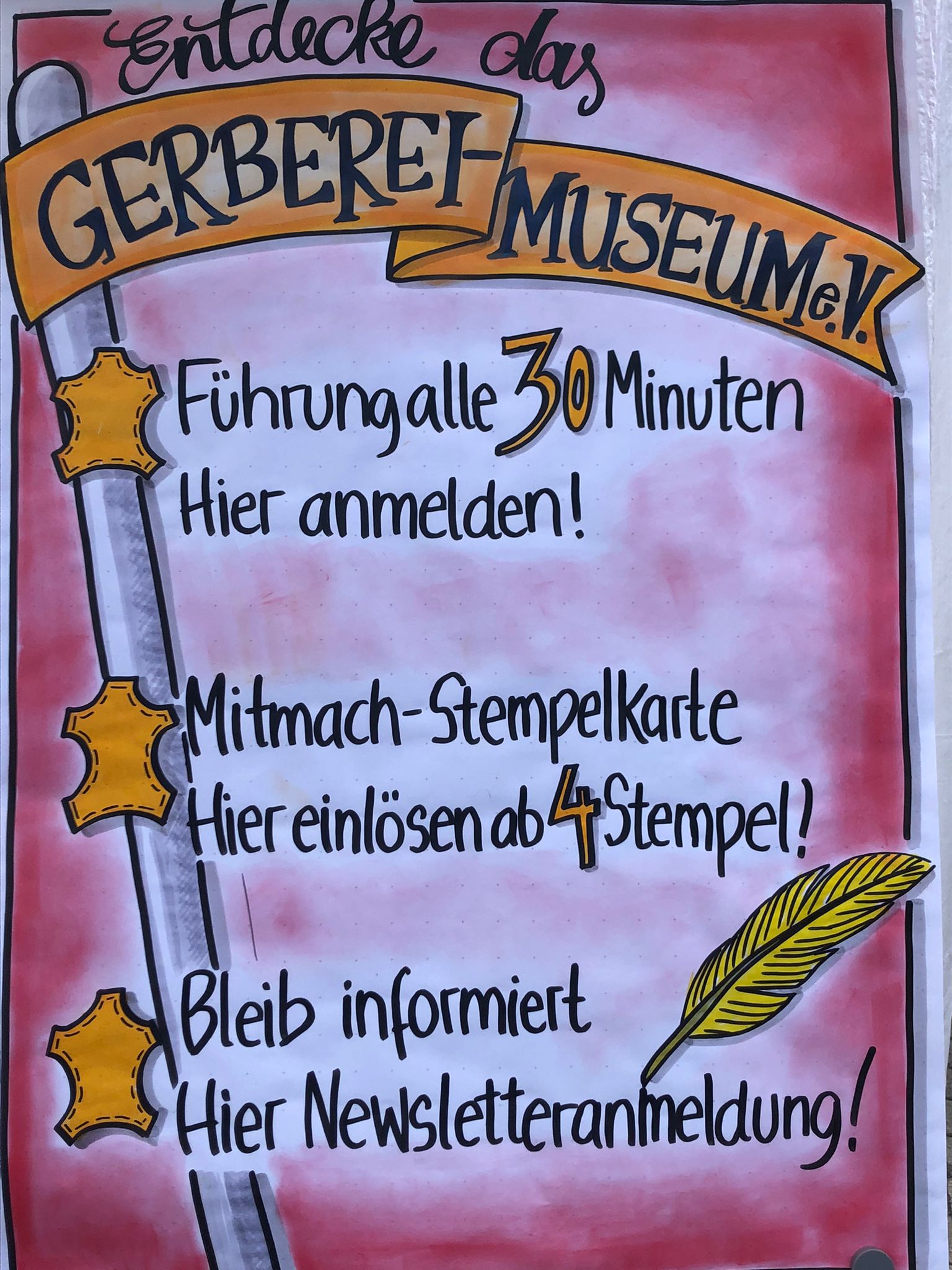 Übrigens hat die Gerberei auch mit vielen Sprichwörtern zu tun, die heut noch benutzt werden. Zum Beispiel „Das geht auf keine Kuhhaut“. Wenn die Eltern mit ihrem Kind oder ihren Kindern schimpfen. Das liegt nämlich daran, dass der Teufel all die Sünden, die man begeht, auf eine Ziegenhaut schreibt, also auf Pergament. Und wenn da all die Sünden nicht mehr draufpassen auf die Ziegenhaut beziehungsweise das Pergament, dann nimmt der Teufel sich eine größere Kuh und schreibt alle Sünden auf die Kuhhaut. Und wenn da nicht mehr alle Sünden raufpassen, dann sagt man: „Das geht ja auf keine Kuhhaut.“
