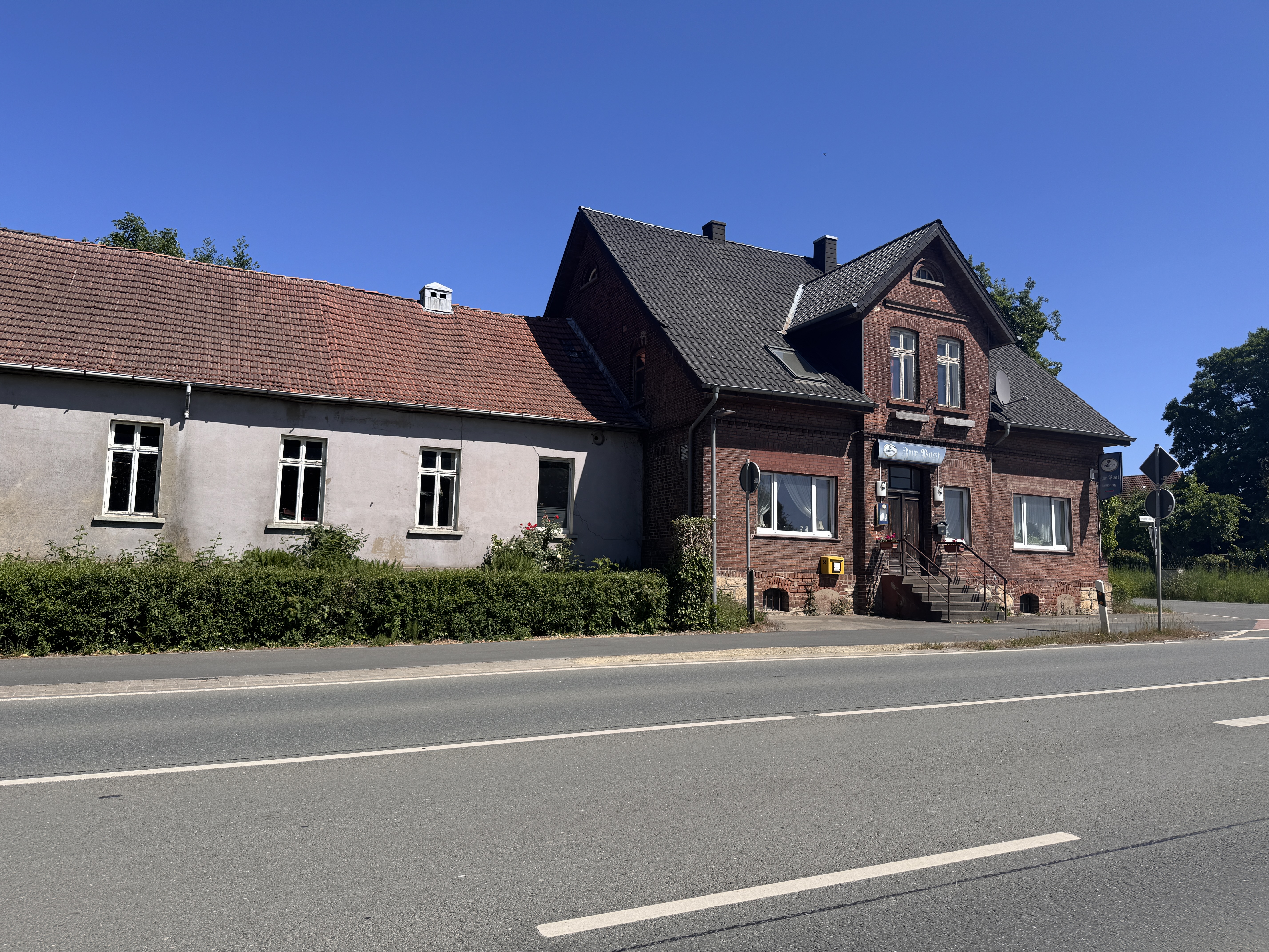 Fast wirkt es, als wolle das Haus selbst noch ein paar letzte Worte sagen, bevor ein neues Kapitel beginnt und zeigt sich im schönsten Mai-Licht. Denn Geschichten gibt es hier mehr als genug. Vermutlich erbaut im Jahr 1870 so steht das rote Backsteinhaus seit fast 150 Jahren an der Herforder Straße. Früher führte hinter dem Hof die Hauptverkehrsader durchs Dorf, Vieh wurde aus Oetinghausen hinaufgetrieben – und wer oben ankam, bekam bei der „Post“ einen Klaren. Daher auch der Name: Das Haus war einst eine Poststelle, durch eine kleine Klappe zahlte man Rente aus, daneben Bäckerei, Kolonialwarenladen, ein Saal mit Bühne, sogar ein kleines Kino, in dem zur Kriegszeit die Wochenschau lief. Die Gaststätte galt damals als SPD-Hochburg – so sehr, dass die SS im Krieg eine Mauer unter dem Saal einriss, um nach versteckten Menschen zu suchen. Die Spuren davon kann man heute noch sehen. Es ist ein Ort, der alles schon einmal war. Nur nicht leer.