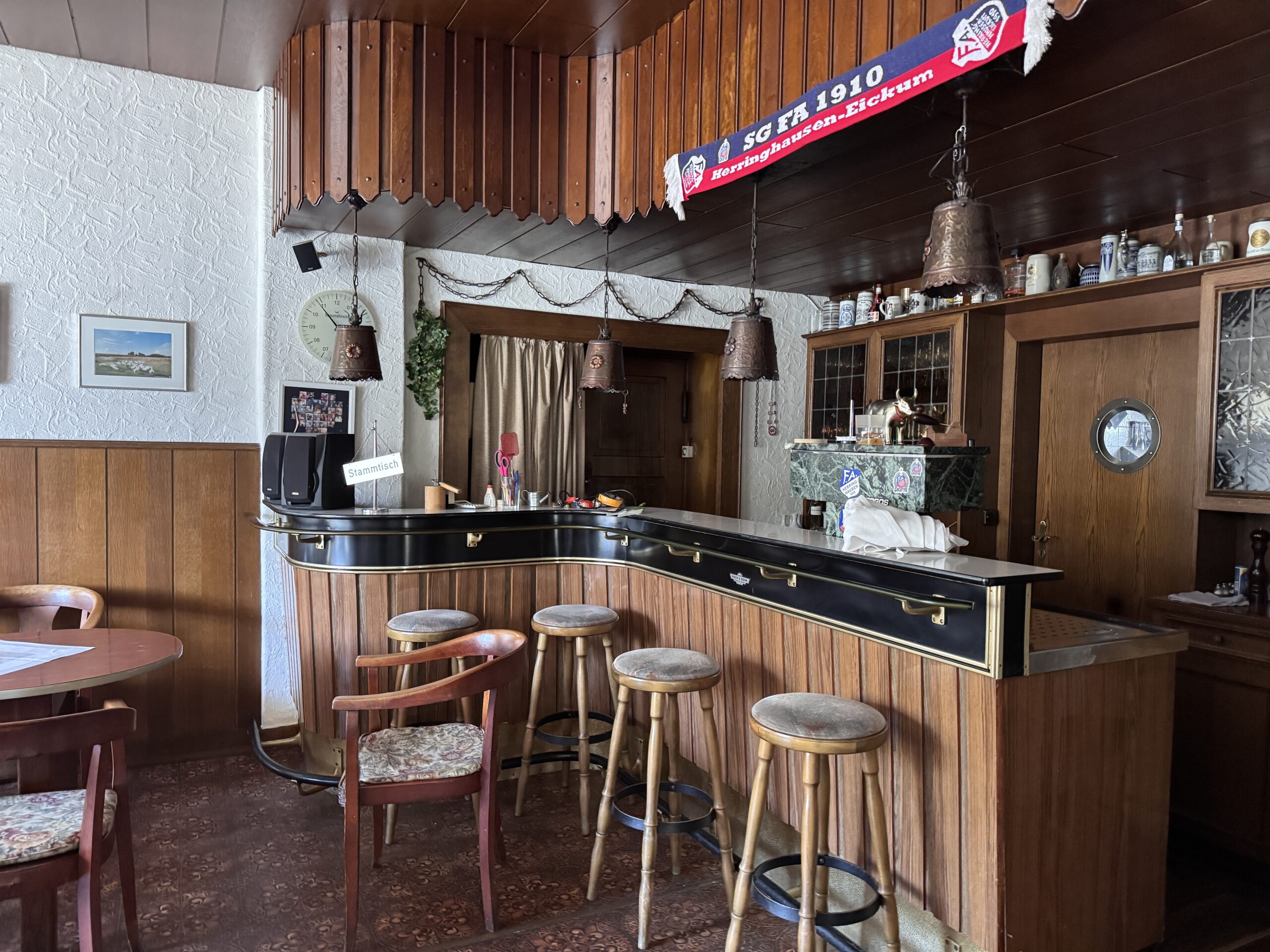 Die Tür quietscht, als man sie öffnet – als hätte sie all die Jahrzehnte mitgezählt, die Gäste ein- und ausgehen sahen. Der erste Blick fällt auf eine Theke aus dunklem Holz, auf Stofflampen, die goldenes Licht auf gemusterte Tischdecken werfen, auf Kupferstiche und Dekoteller an den Wänden. Es riecht nach Holz, Geschichte und – wenn man Glück hat – noch ein wenig nach westfälischem Pickert.