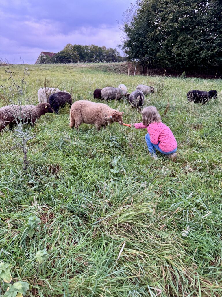 Und so spannte ich den Hänger an, fuhr zum Hof Möller und holte „Lämmchen“ ab. Ein bisschen aufgeregt war sie schon, das kleine Flaschenkind, aber erstaunlich brav lies sie sich von Hennig Möller in den Hänger tragen. Zuhause angekommen, stand sie erst kurz unsicher da, dann trabte sie los – direkt hinein in ihre neue Herde. Und nicht allein: Zwei weitere Schafe vom Gnadenhof, die ich ebenfalls dauerhaft übernommen habe, wurden schnell zu Lämmchens Freunden. Nun sind die drei ein kleines Team das ganze Jahr über – und Lämmchen darf bleiben. Für immer. Kein Schlachttermin und kein Hänger in den Schlachthof. Stattdessen eine Wiese, eine Herde und ein Zuhause, das nicht nur für eine Saison gedacht ist.