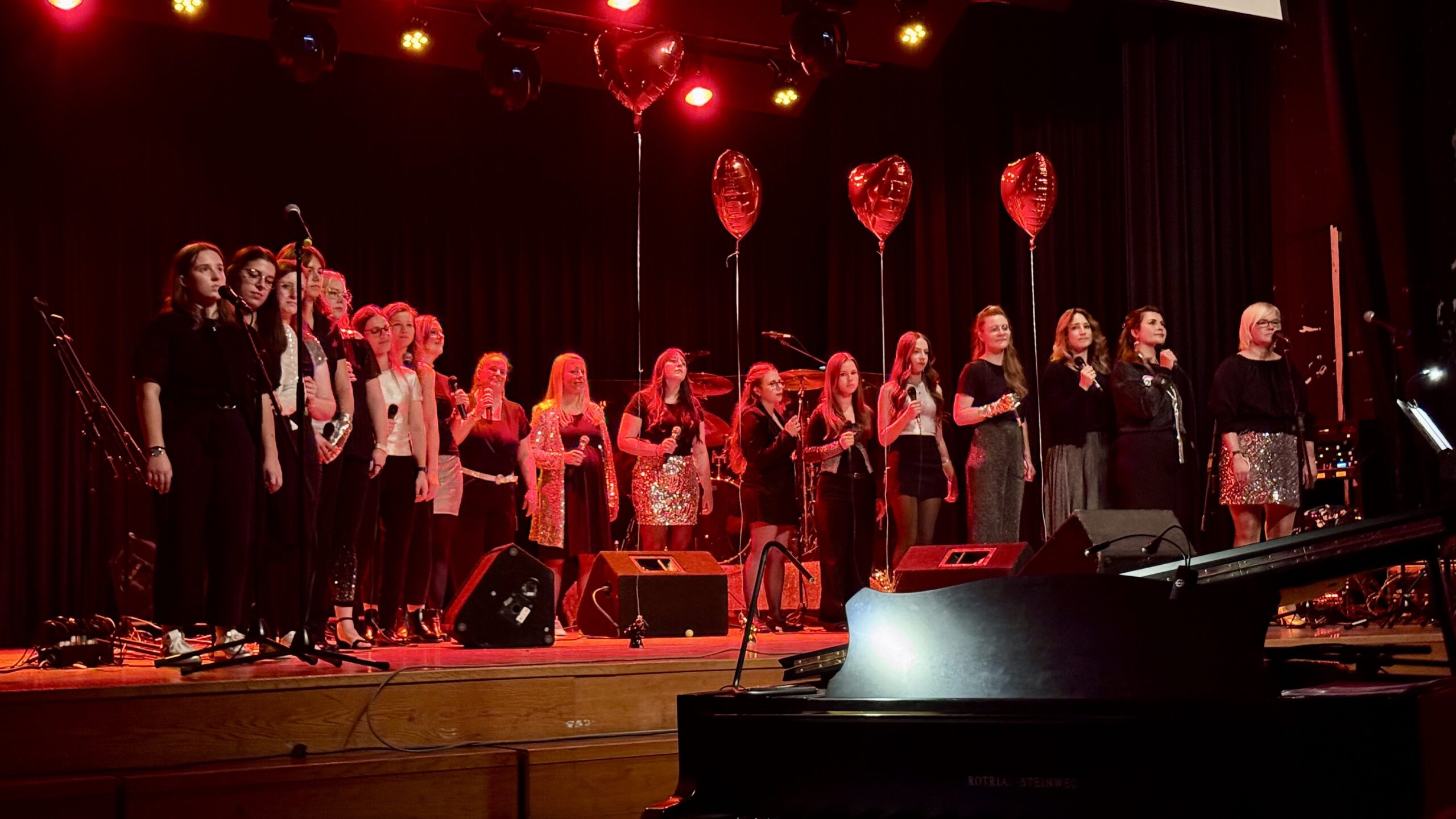 Unter der Leitung von Martina Böske, die charmant und persönlich durch den Abend führte, präsentierten die 18 Sängerinnen ein abwechslungsreiches Programm aus deutschen und englischen Pop- und Chorsongs – perfekt abgestimmt, klanglich vielfältig und mit sichtbarer Freude am Detail. Im Hintergrund live dazu Schlagzeug und Gitarre. Von „Applaus, Applaus“ über „Toxic“ bis zu „Hungriges Herz“ reichten die Titel – jedes Lied begleitet von einer eigenen Choreografie, mal gefühlvoll, mal kraftvoll, mal augenzwinkernd.