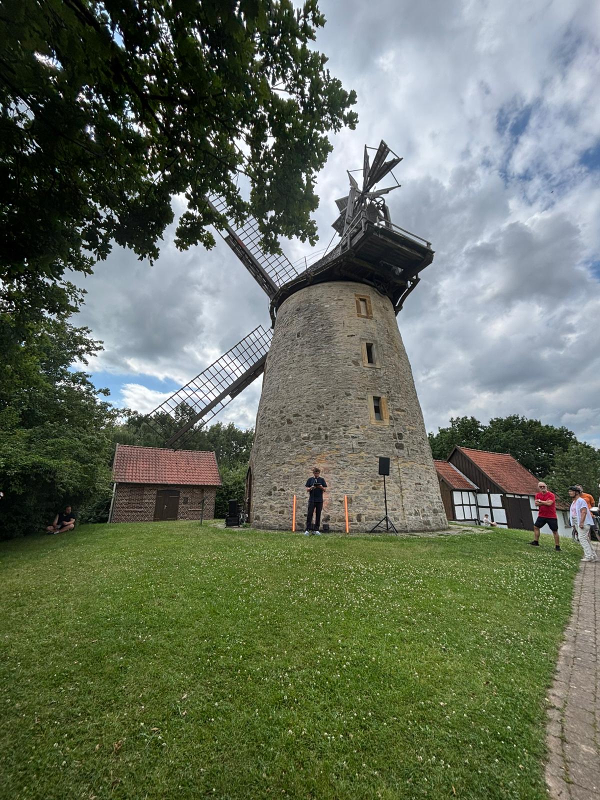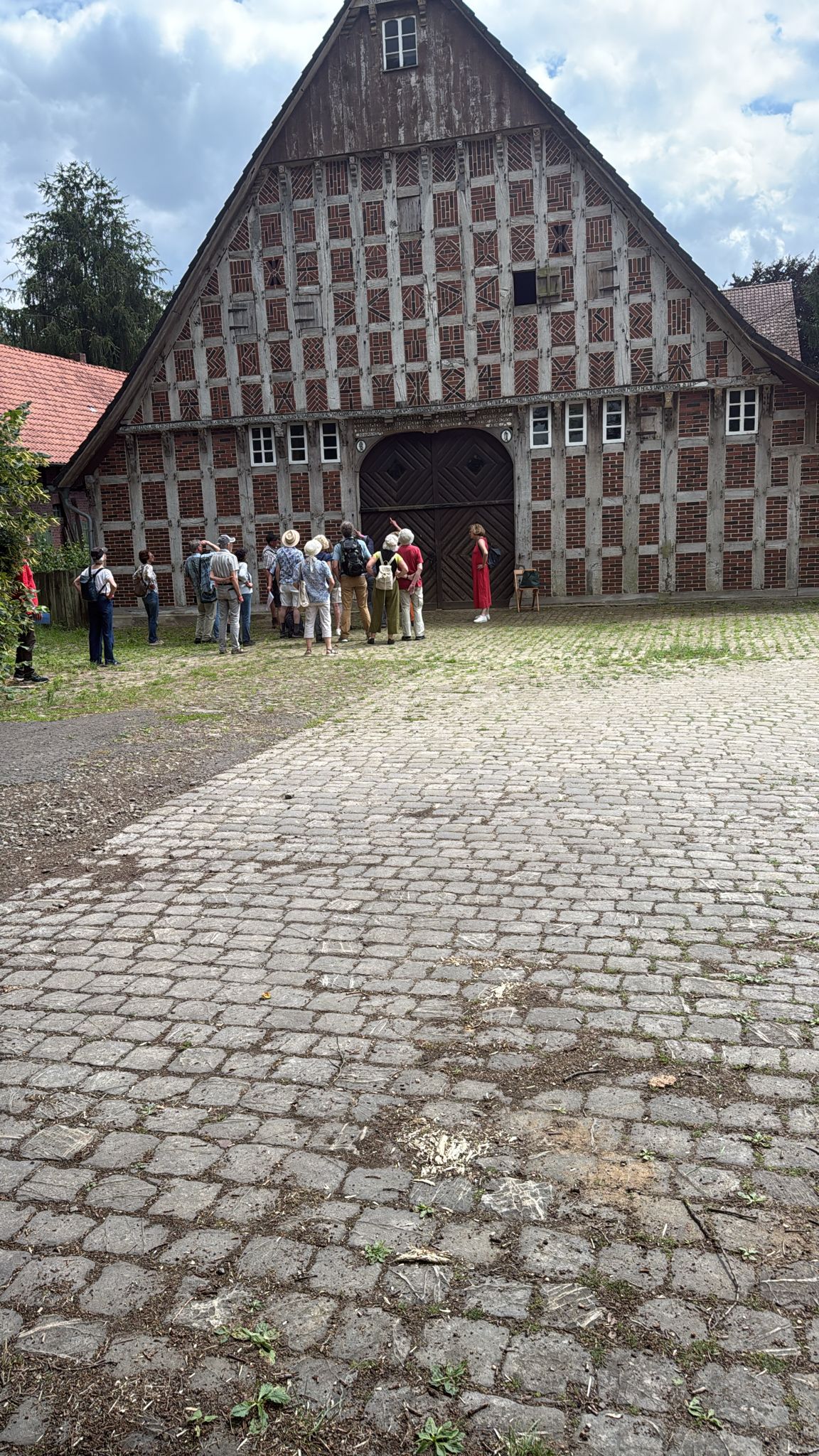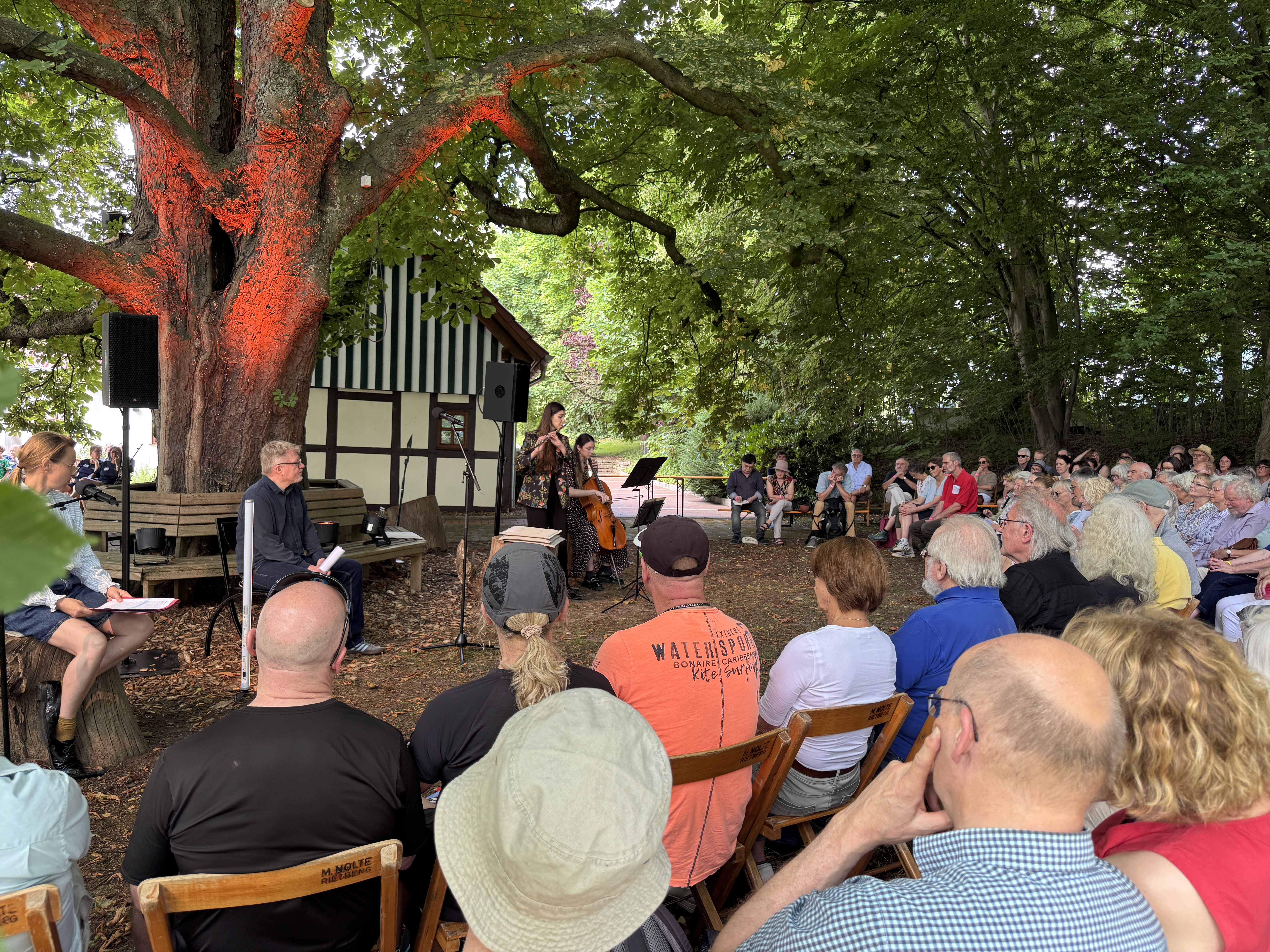 Zwischen Stiftskirche, Liesbergmühle und Sattelmeierhöfen wurden Musik und Texte in kleinen Portionen serviert. Kein Bühnenbombast, keine Großgeste – sondern feine, präzise Momente an Orten, die oft übersehen werden. Die Wandergruppe wurde vom Heimatverein Enger geführt, die Radlergruppe vom ADFC Enger-Spenge. Beide trafen sich am Ende unter der imposanten Kastanie auf dem Hof Mey, ein schattiger Ort, wie gemacht für letzte Takte und letzte Worte.